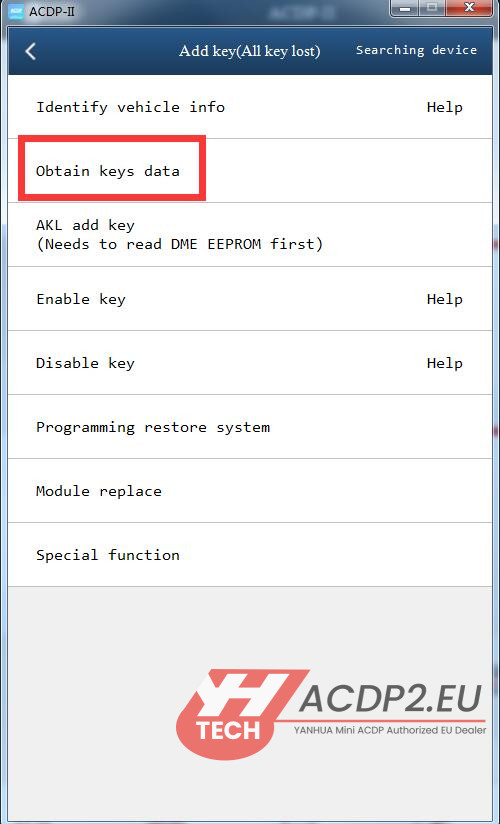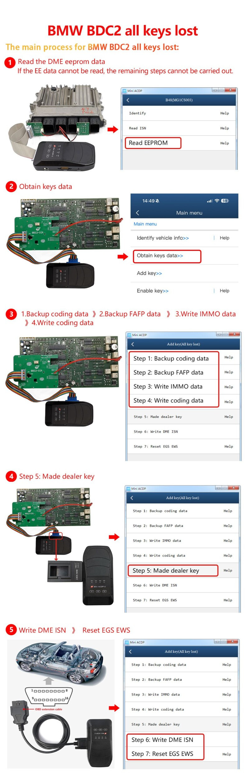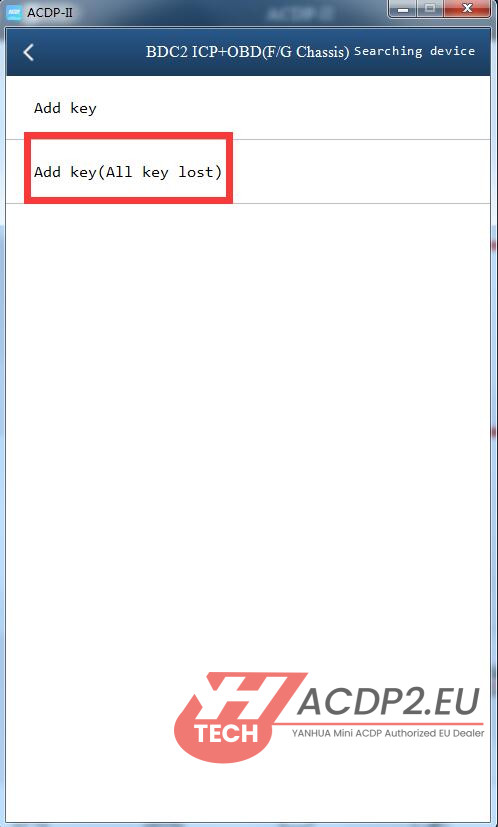 Select BMW-> FEM/BDC-> IMMO/Mileage-> BDC2 ICP+ OBD (F/G Chassis)-> Add Key (All key lost)-> Obtain keys data