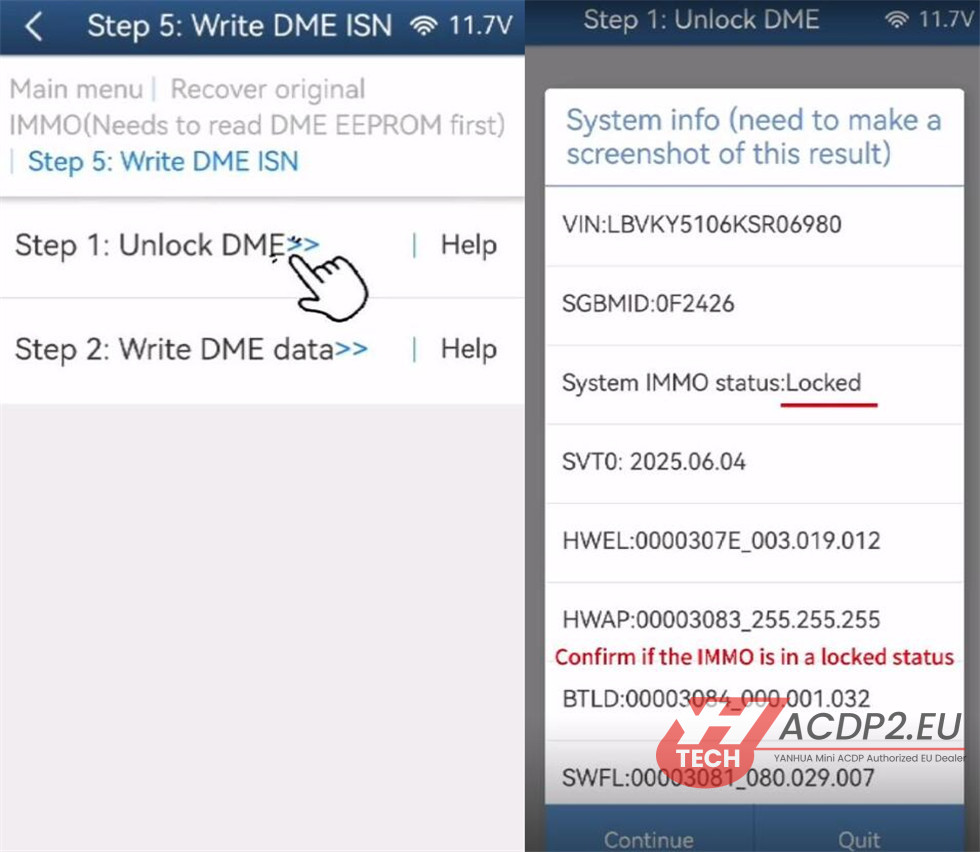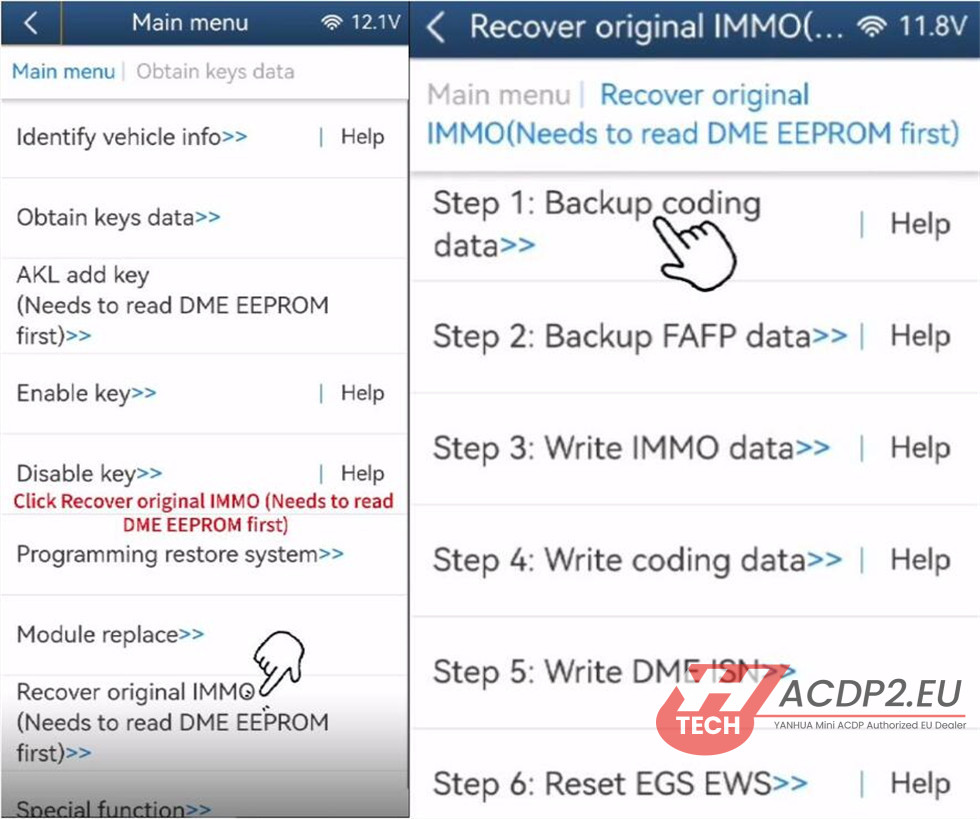 Reinstall BDC2, connect via OBD, and select “Recover original IMMO (Needs to read DME EEPROM first).”