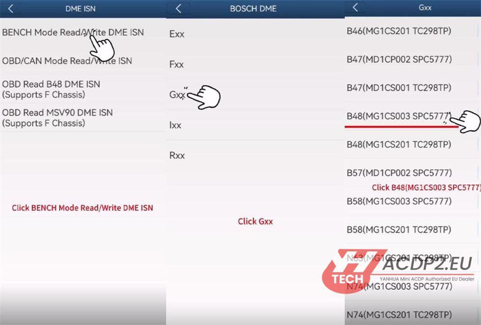 In ACDP App, navigate to: BMW → DME ISN → Bench Mode Read/Write DME ISN → BOSCH DME → Gxx → B48 ECU (e.g. MG1CS003 SPC5777).