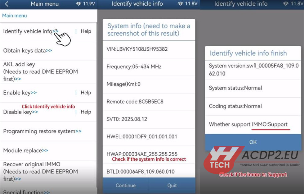 Identify and save vehicle info. Verify that the IMMO type is supported.
