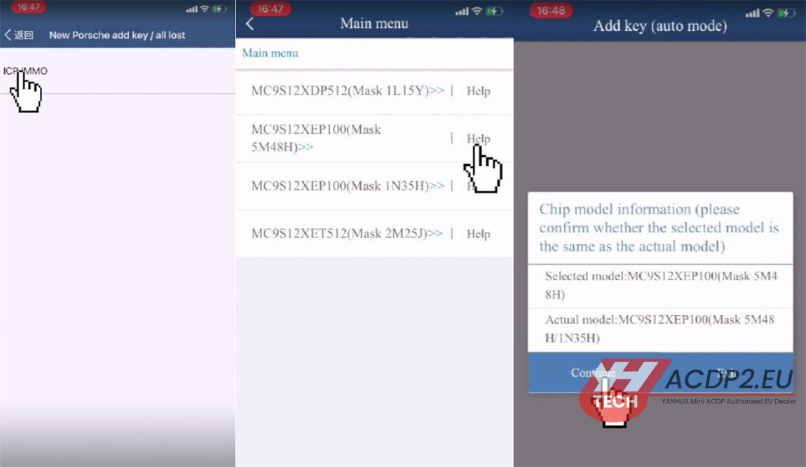 Porsche-> New Porsche add key/all lost-> ICP IMMO-> Select corresponding mask (e.g.MC9S12XEP100 (Mask 5M48H))-> Add key (auto mode)