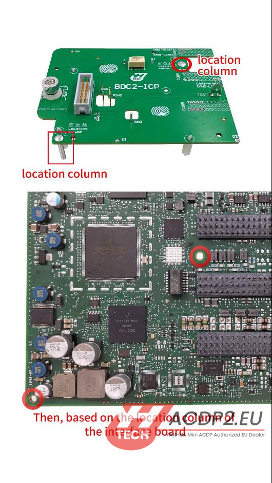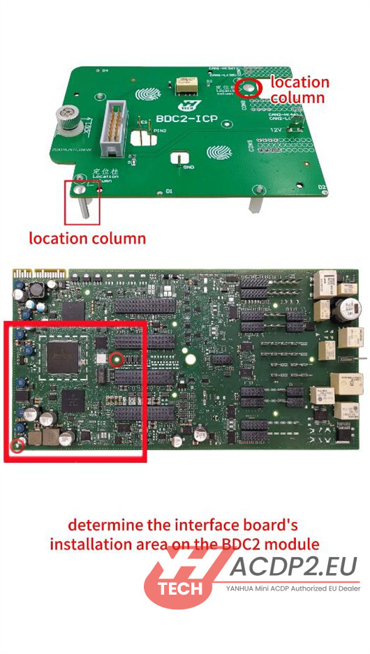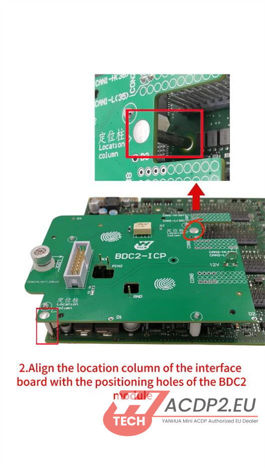 Align the location columns of the interface board with the positioning holes on the BDC2 module.